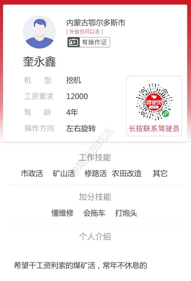 看详情本人叫旦增罗布,学历:高中毕业,高中毕业后没有去读大学,去开家里的挖掘机,但工作找不到,需要的老板联系,挖掘机型号是斗山230,能吃苦耐劳,尽职尽责